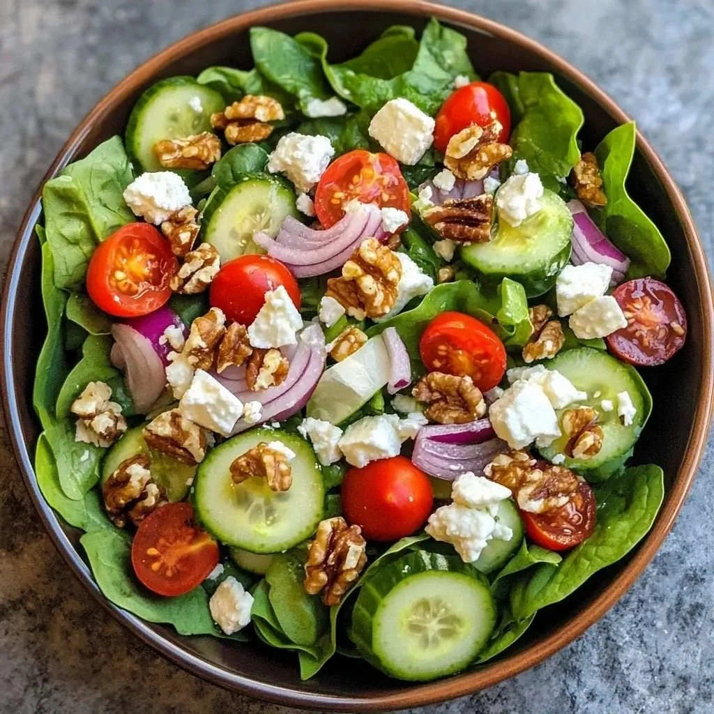 Picture a bowl of vibrant greens that glimmer like fresh emeralds under the kitchen lights. The air is perfumed with the sweet acidity of halved cherry tomatoes, their juice barely clinging to your fingertips. You hear the gentle crunch of cucumber slices, a satisfying snap that promises a refreshing bite. The scent of feta cheese, salty and creamy, mingles with the earthy aroma of toasted walnuts. The whole scene feels like a living painting that invites you to taste the colors.