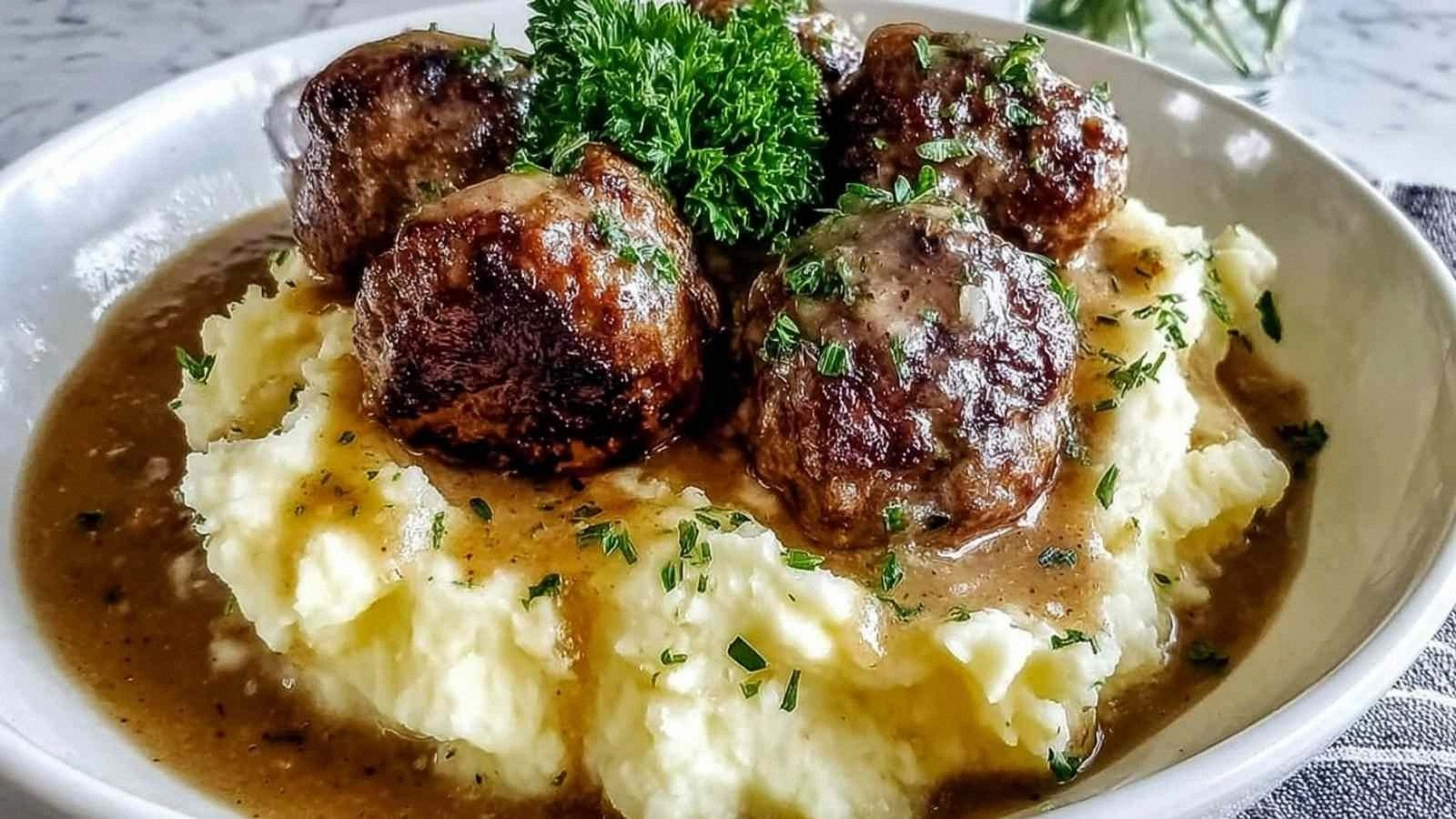 - Step 7: Finish and Serve. Sprinkle 2 tbsp fresh parsley over the meatballs and sauce for a burst of color and freshness. Transfer the meatballs and sauce onto a serving platter, and ladle the mashed potatoes beside or underneath them. The final dish should look like a rustic, gourmet comfort plate—golden meatballs, velvety gravy, and buttery mash. Plate each portion with care, ensuring the sauce coats each meatball evenly. Serve immediately, and watch as the steam rises and the aromas mingle in the air.
